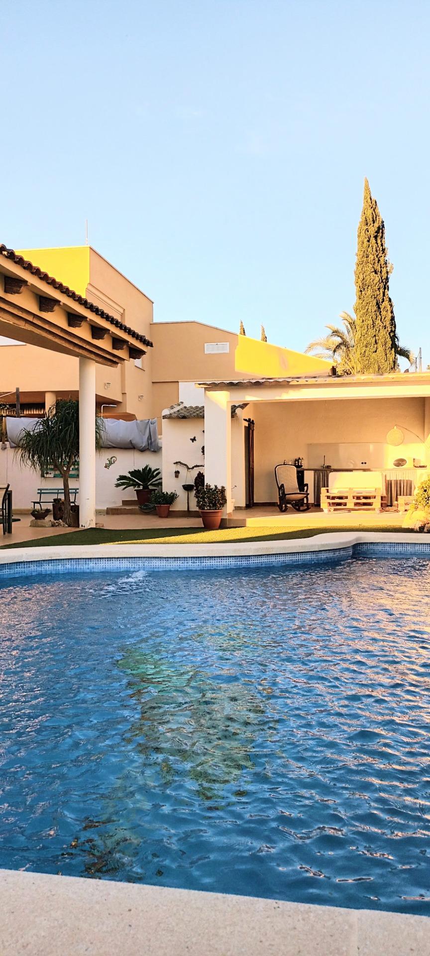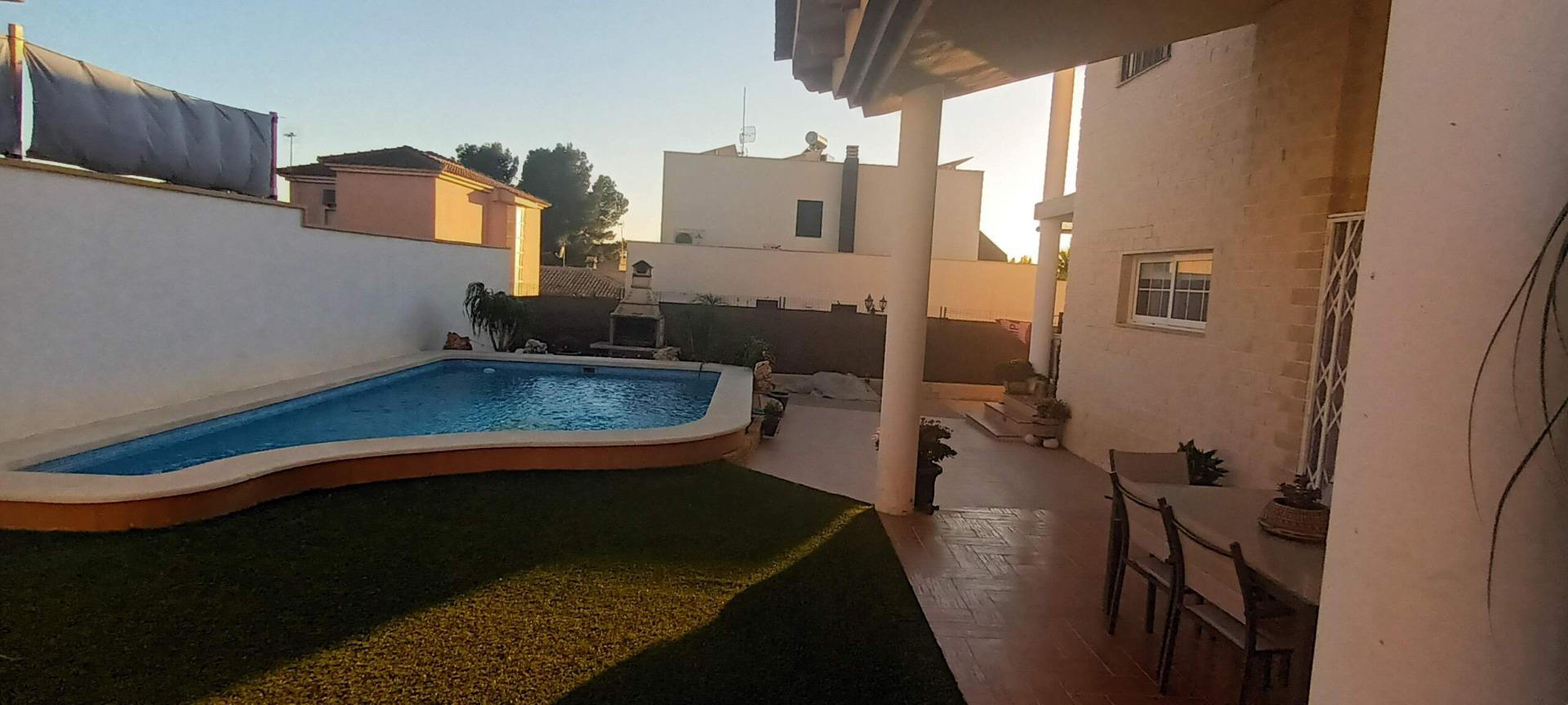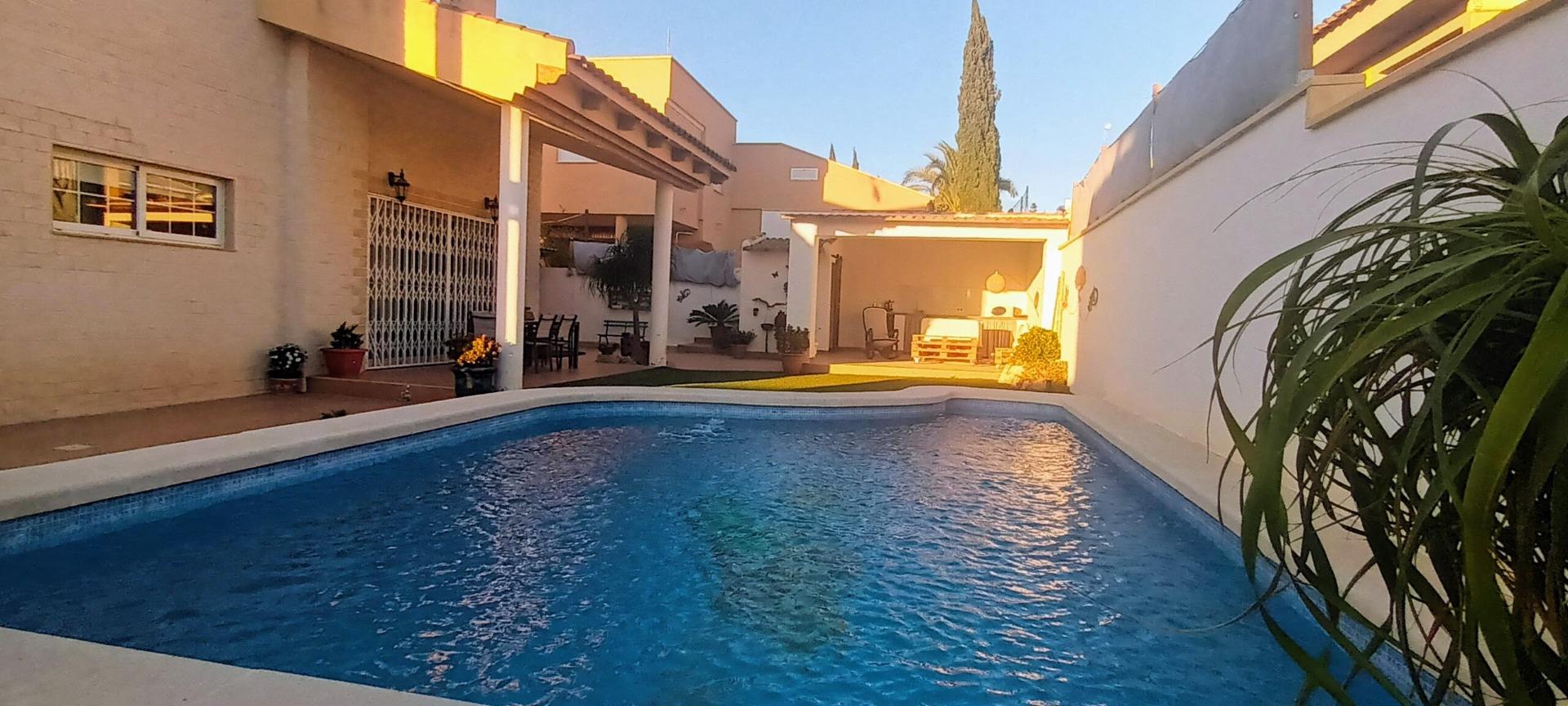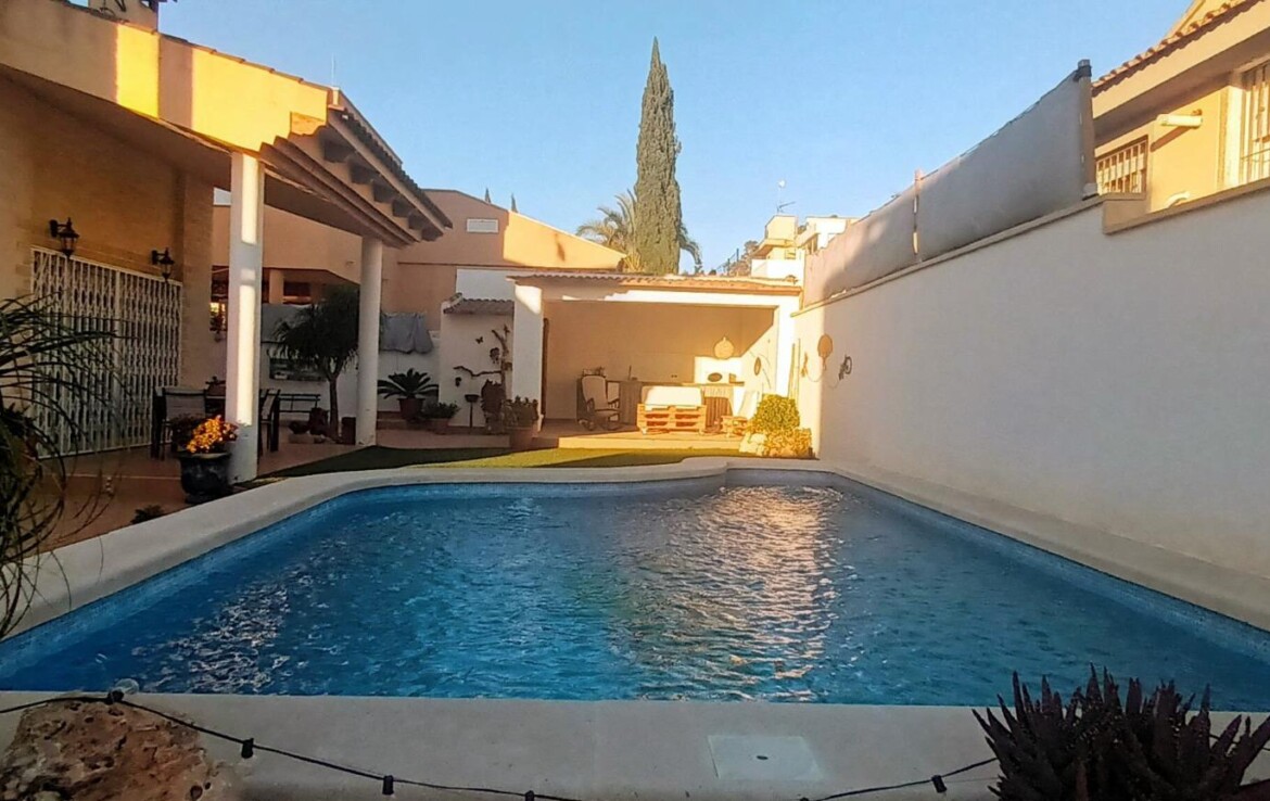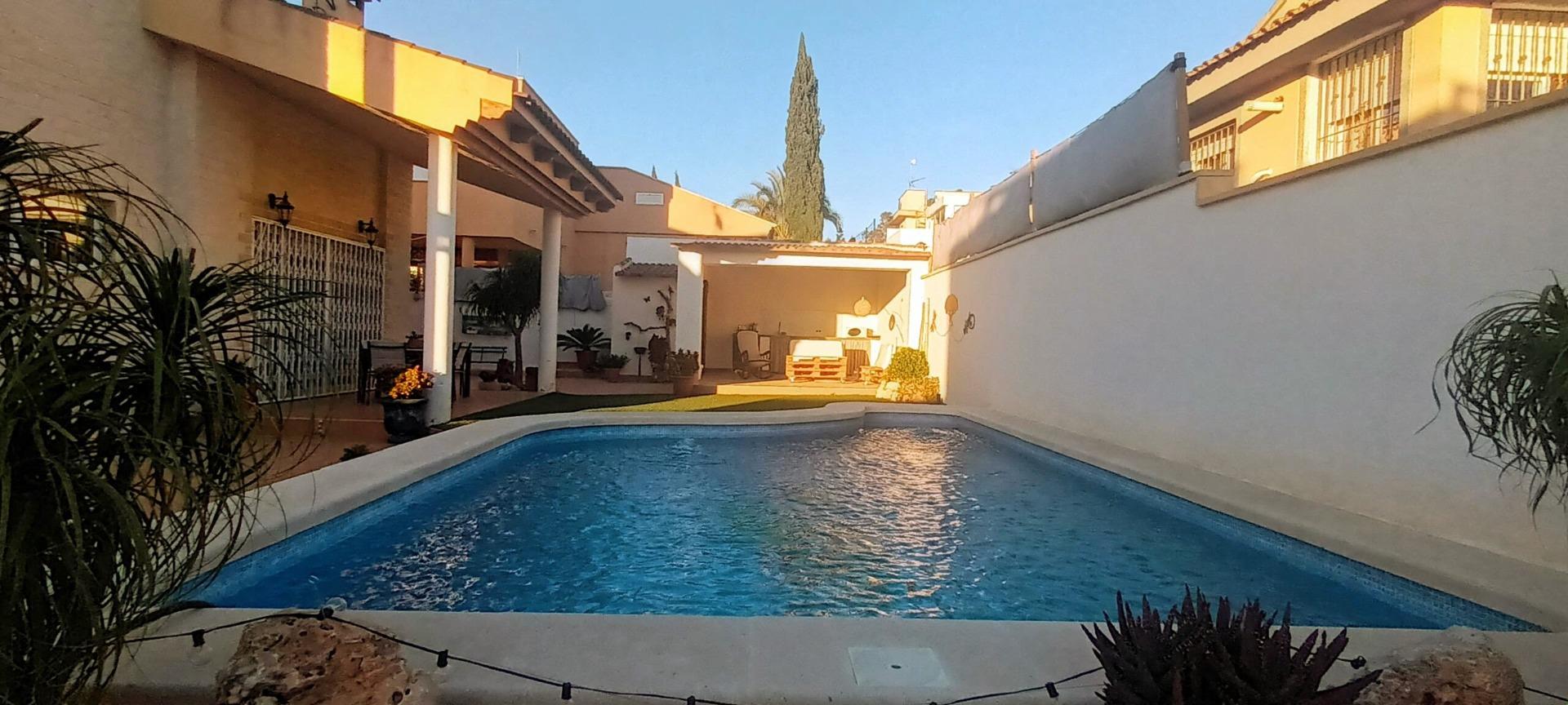 Chalet individual en la mejor zona de La Alcayna !! Cuenta con 241 m. de superficie construida distribuida en 2 plantas las siguientes estancias: salón comedor en 2 alturas con chimenea francesa, cocina totalmente equipada tipo americana, 4 habitaciones dobles, 3 baños, trastero y garaje para vehículo mediano con un altillo de gran capacidad de almacenamiento. A nivel de parcela dispone de una superficie techada de aparcamiento para dos coches.~~En la planta primera nos encontramos con un amplio salón comedor a doble altura con chimenea integrada en el mismo y cocina abierta a salón, un dormitorio doble, pudiendo hacer la función de principal, un baño. Planta superior, tres dormitorios y un baño. Excelente ubicación junto a todos los servicios, colegios.~La casa está dotada de todo tipo de extras tales como: aire acondicionado, armarios empotrados, barbacoa, calefacción central con caldera individual, despensa, pérgola con cocina de verano y una vonita piscina privada.~En la urbanización encontrará muy a la mano servicios como linea regurla de autobuses, centros comerciales, centro médico, colegios, supermercados, vigilancia 24h, zonas infantiles, etc…~~Llámenos para conocer más detalles !!~~~