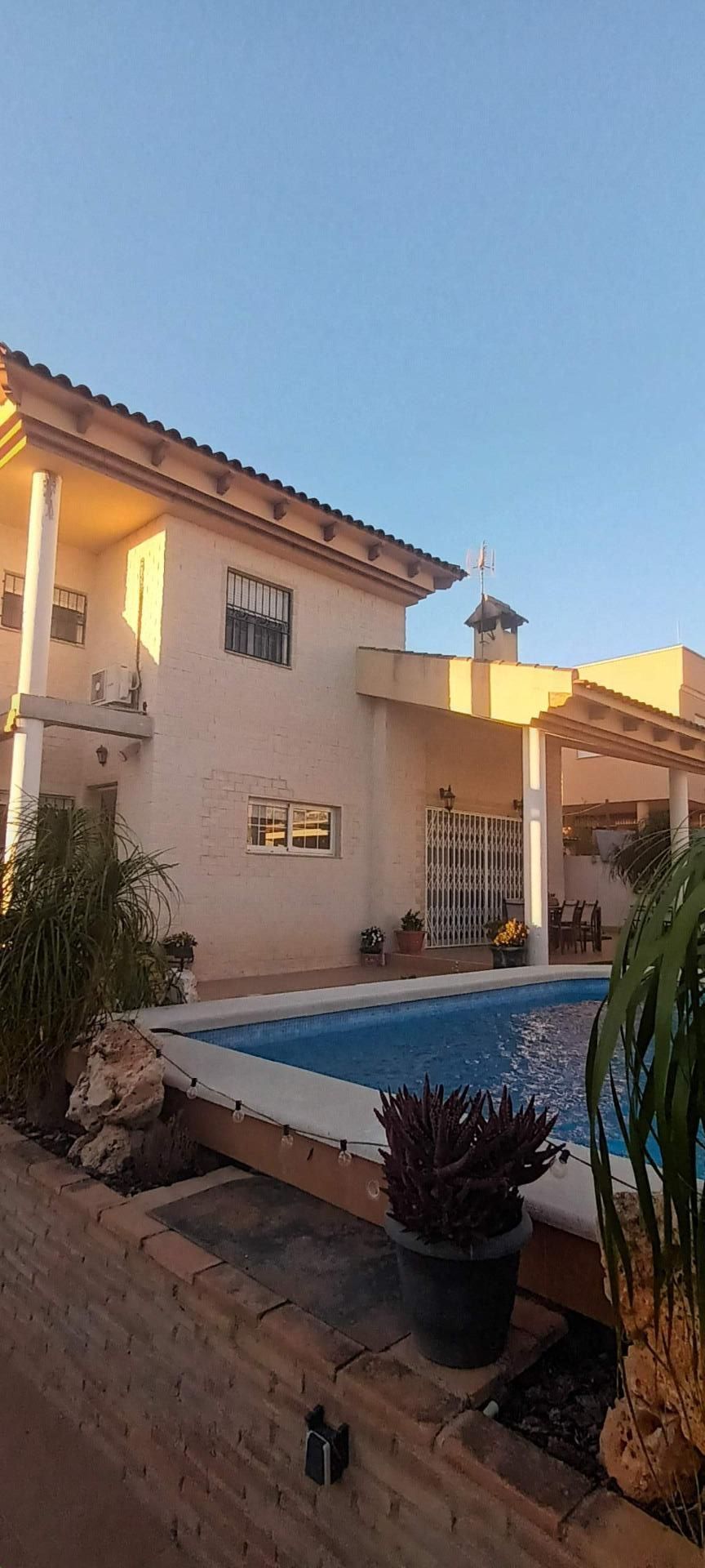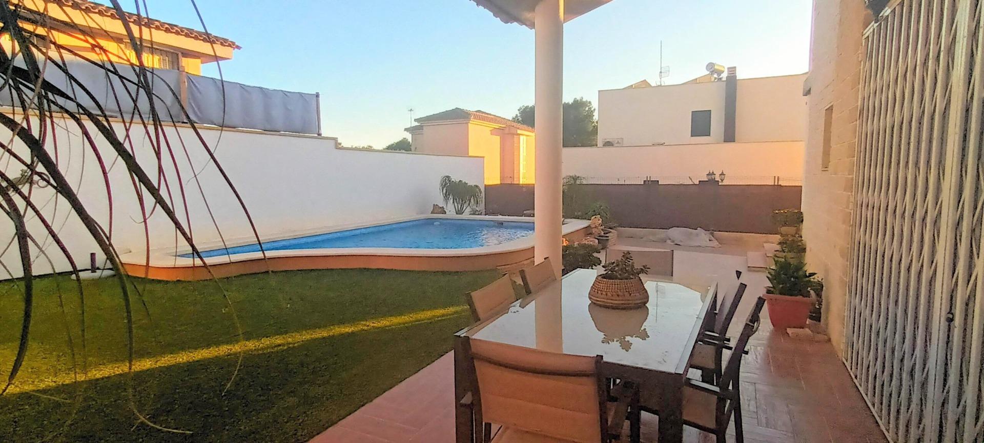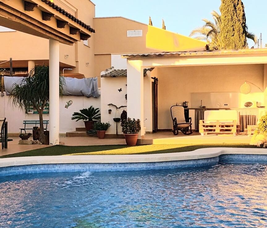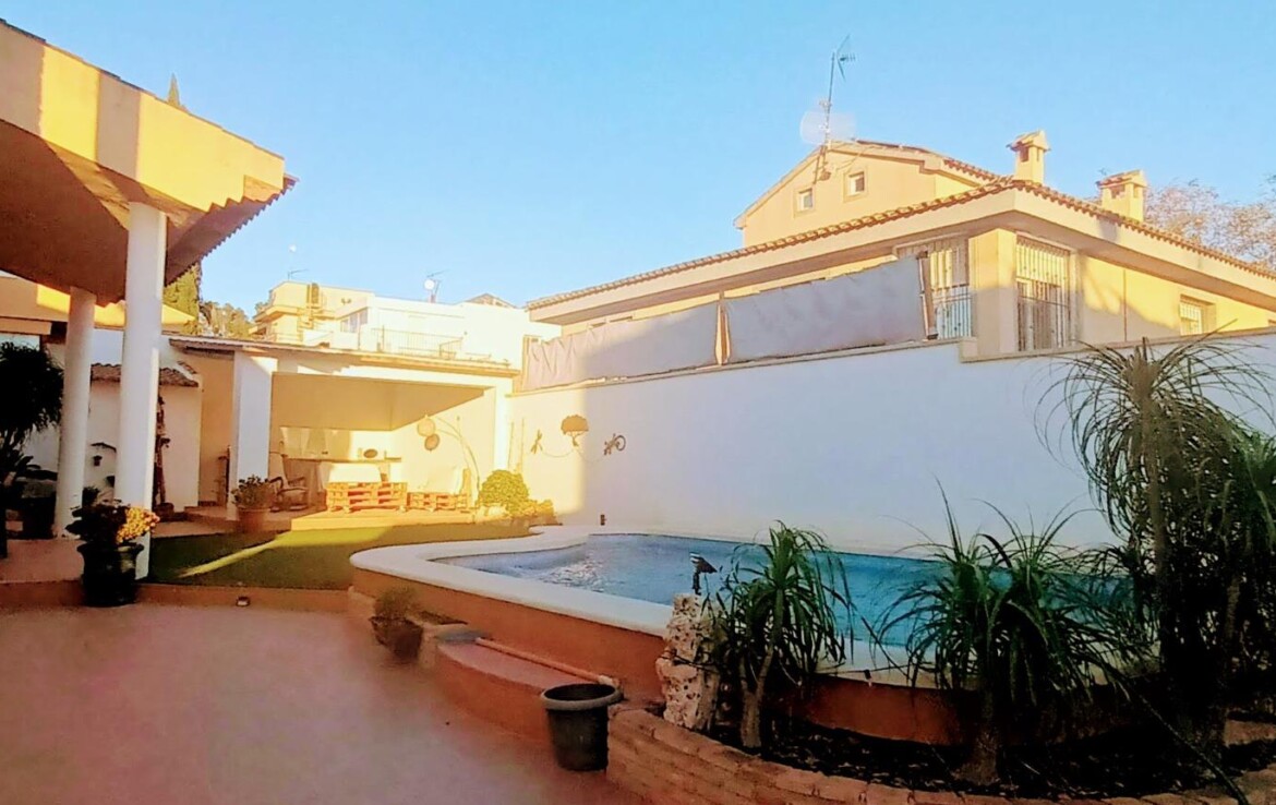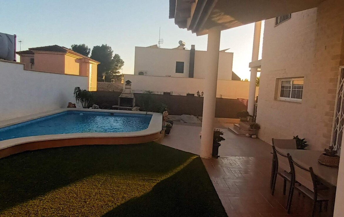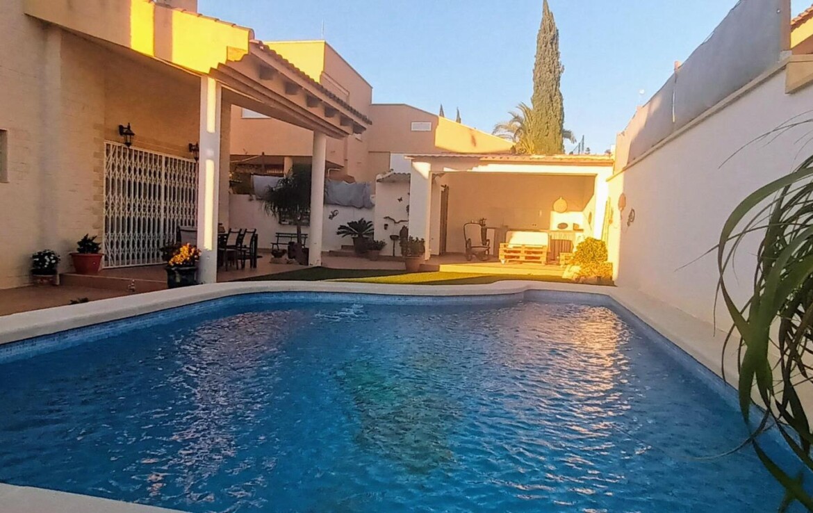 Chalet individual en la mejor zona de La Alcayna !! Cuenta con 241 m. de superficie construida distribuida en 2 plantas las siguientes estancias: salón comedor en 2 alturas con chimenea francesa, cocina totalmente equipada tipo americana, 4 habitaciones dobles, 3 baños, trastero y garaje para vehículo mediano con un altillo de gran capacidad de almacenamiento. A nivel de parcela dispone de una superficie techada de aparcamiento para dos coches.~~En la planta primera nos encontramos con un amplio salón comedor a doble altura con chimenea integrada en el mismo y cocina abierta a salón, un dormitorio doble, pudiendo hacer la función de principal, un baño. Planta superior, tres dormitorios y un baño. Excelente ubicación junto a todos los servicios, colegios.~La casa está dotada de todo tipo de extras tales como: aire acondicionado, armarios empotrados, barbacoa, calefacción central con caldera individual, despensa, pérgola con cocina de verano y una vonita piscina privada.~En la urbanización encontrará muy a la mano servicios como linea regurla de autobuses, centros comerciales, centro médico, colegios, supermercados, vigilancia 24h, zonas infantiles, etc…~~Llámenos para conocer más detalles !!~~~