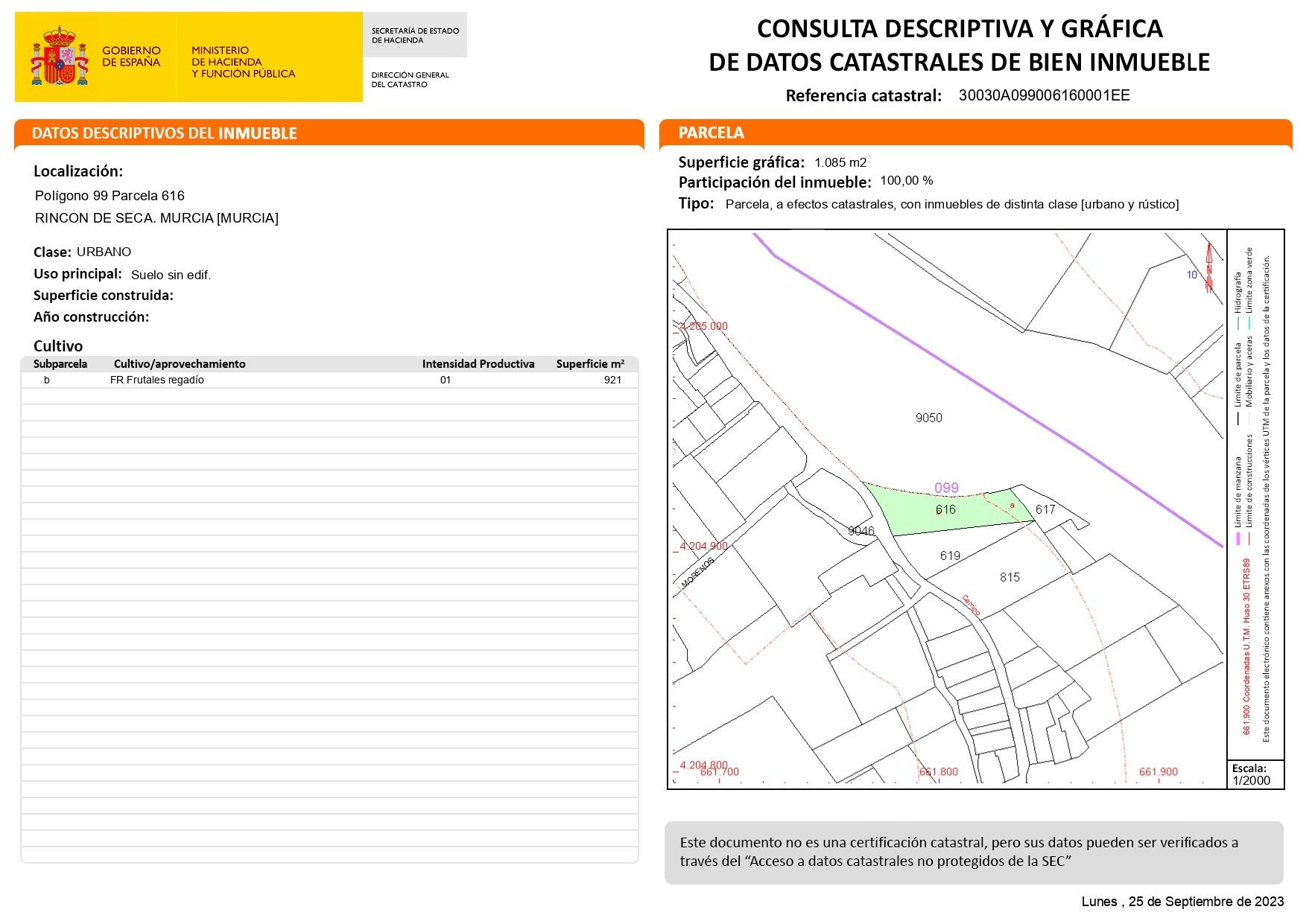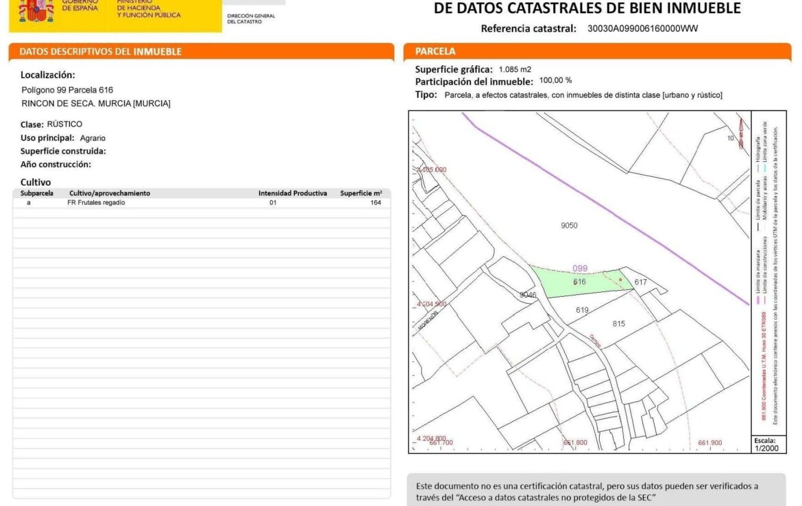 Parcela urbana de 1085 m2 en La Arboleja, (Rincón de Seca), muy bien comunicada por carretera y servicio de autobús, vistas despejadas y próxima al rio Segura.~~Se puede construir una edificación de 300 m2.~~Medida de fachada 30 m2 y da a camino.~~Si quieres más información ponte en contacto con nosotros.~~Gastos de venta y honorarios de agencia no incluidos en el precio de venta.~